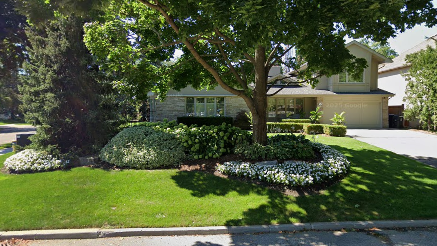 A typical modern suburban garden, featuring large areas of empty lawn and planted almost entirely with non-native plants (featuring the usual suspects: Yew, Boxwood, Euonymus, Hosta, Hydrangea, annual Impatiens, and a Japanese maple). The sugar maple tree and eastern white cedar hedge are the only natives in this garden.