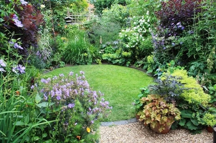 Great use of a small circular lawn as a destination and viewing platform. It also provides a place for the eye to rest and helps to define the plants surrounding it